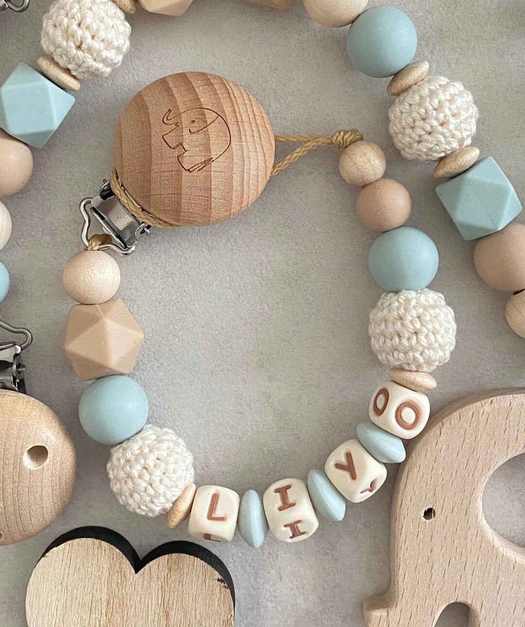 Schnullerkette mit Name Kinderwagenkette personalisiert Junge Elefant Blau Beige